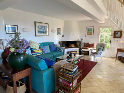 Sitting room, open log fire and dining area, french